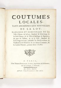[ARTOIS / COUTUMES]. — Coutumes locales, tant anciennes que nouvelles de la Loy, Banlieue et Echevinage de la Ville d'Arras ; de la Loy, Banlieuë & Echevinage de la Cité d'Arras ; de la Ville & Bailliage de Bapaume ; du pays de l'Allœu, de la...