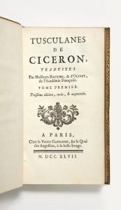 [CICÉRON]. — Tusculanes de Ciceron, traduites par Messieurs Bouhier, & d'Olivet, de l'Académie Françoise. — A Paris, Chez la Veuve Gandouin, 1747. — 2 volumes in-12 (96 x 164 mm), maroquin vert, filet, fine roulette dentelée et large...