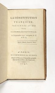 [CONSTITUTION]. — La Constitution françoise, présentée au Roi par l'Assemblée nationale, le 3 septembre 1791, acceptée le 13 et le 14. — A Paris, De l'Imprimerie de Du Pont, député de Nemours, Hôtel de Bretonvilliers, Isle Saint-Louis,...