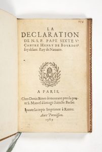 [HENRI III & HENRI IV]. — • La Declaration de N. S. P. Pape Sixte V contre Henry de Bovrbon, soy disant Roy de Nauarre. A Paris, Chez Denis Binet, 1589 (16 pp.). — • Bvlla S. D. N. Sixti Papæ V contra Henricvm III. Parisiis, Apud Nicolaum...