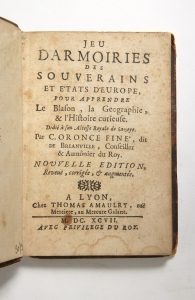 [HÉRALDIQUE]. FINÉ de BRIANVILLE (Claude Oronce). — Jeu d'armoiries des souverains et États d'Europe […]. — A Lyon, Chez Thomas Amaulry, 1697. In-16, veau, dos à nerfs orné (reliure de l'époque).