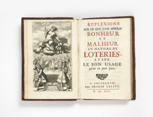 [JEUX - Le CLERC (Jean)]. — Réflexions sur ce que l'on appelle bonheur et malheur en matiere de loteries, et sur le bon usage qu'on en peut faire. — A Amsterdam, Chez George Gallet, 1696. — In-12, veau, dos à nerfs (reliure de l'époque).