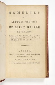 [RELIURE en MAROQUIN ROUGE aux ARMES]. — Homélies et lettres choisies de Saint Basile le Grand. — A Paris, Chez Crapart, Libraire, 1788. — In-8°, maroquin rouge à grain long, filets et fine roulette dentelée dorés encadrant les plats,...