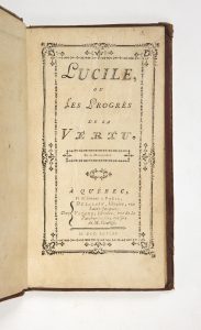 [RESTIF de La BRETONNE (Nicolas Edme)]. — Lucile, ou Les Progrès de la vertu. — À Québec, Et se trouve à Paris, Chez Delalain, libraire, & Valade, libraire, 1768. — In-12, basane brun-rouge, dos lisse orné (reliure de l'époque).