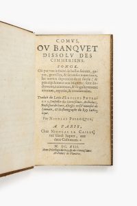 banquets) sont doctement, naïvement, & singulierement décrites, reprises, & condamnées. — Traduction par Nicolas Pelloquin. — A Paris, Chez Nicolas La Caille, 1613. — Petit in-12, maroquin fauve, triple filet doré encadrant les plats, dos lisse orné, tranches dorées (reliure fin XVIIIe s.).