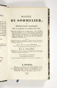 [ŒNOLOGIE]. — JULLIEN (A.). — Manuel du sommelier, ou Instruction pratique sur la manière de soigner les vins ; contenant la Théorie de la dégustation […]. — Paris, Chez l'Auteur, Colas, Huzard & Renard, 1826. — In-12, demi-veau vert,...