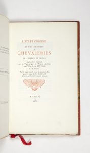 [ORDRES de CHEVALERIE]. DAVITY (Pierre). — Liste et origine de tous les ordres de chevaleries militaires et civils qui ont été institués par les papes et les princes chrétiens jusqu'à la fin du XVIe siècle. — Turin, 1876. — Grand in-12,...