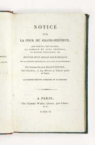 [OTTOMAN (Empire)]. — BEAUVOISINS (Joseph Eugène). — Notice sur la Cour du Grand-Seigneur, son sérail, son harem, la famille du sang impérial, sa maison militaire, etc. — Suivi d'un essai historique sur la religion mahométane, son culte et...