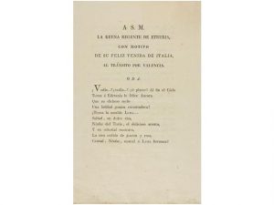 1808 ca. (CASA REAL - VALENCIA). ODA. A S.M. LA REYNA REGENTE DE ETRURIA, CON MOTIVO DE SU FELIZ VENIDA DE ITALIA, AL TRÄNSITO POR VALENCIA. [Valencia], s.l.n.i.n.a., sa. 4° menor. [8] p. Cubiertas de papel de guardas antiguo. Ejemplar con todos...