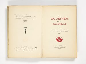[CURIOSA]. — CŒUR-BRÛLANT [Mannoury d'Ectot (Mme de), dite Vicomtesse de]. — Les Cousines de la Colonelle par Madame la Vicomtesse de Cœur-Brulant. — Lisbonne, Chez Antonio da Boa-Vista [i. e. Bruxelles, Gay et Douc], 1934. — 2 tomes en un...