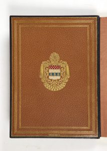 les plats, doublure de maroquin brun clair ornée de filets dorés et d'armoiries mosaïquées au centre, gardes de tabis tabac, tranches dorées, couverture illustrée conservée (P. Affolter - J. Augoyat sr. / A. Cuzin).