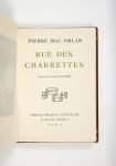 MAC ORLAN (Pierre). — Rue des Charrettes. — Paris, Émile Hazan Éditeur, 1927. — Petit in-8°, maroquin lie-de-vin, filet et large dentelle mosaïquée et dorée encadrant le premier plat, large fleuron doré et mosaïqué au centre du second,...