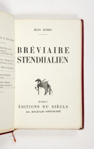 [STENDHAL]. — RODES (Jean). — Bréviaire stendhalien. — Paris, Éditions du Siècle, s. d. [1926]. — In-12, maroquin framboise janséniste, dos à nerfs, tête dorée, non rogné, couverture conservée (Stroobants).