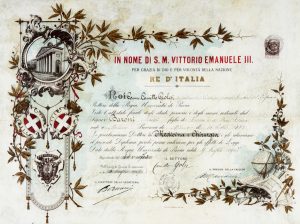 Documento pergamena a stampa e manoscritto riccamente decorato a colori e con fregi dorati, con i simboli della Regia Università di Pavia, e dei Savoia. Ottime condizioni. Dimensioni: 500x 375 mm. (1)