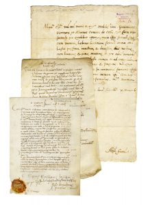 Manoscritto a inchiostro bruno su carta con filigrana. 1 bifolio, scritta 1 pagina. Sigillo a rilievo al recto della prima carta. Un antico timbro di appartenenza (di libreria antiquaria non più in attività) a inchiostro blu. Testo in latino con abbreviazioni. Nel lotto anche 1 carta, parzialmente tagliata, probabilmente autografa di Guarini. Dimensioni: mm 295x200. SI AGGIUNGONO: 2 pergamene del XV secolo. (3)