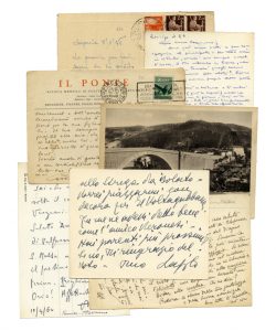 Manoscritti e dattiloscritti a inchiostro nero e blu. 2 carta scritte 2 pagine. Dimensioni varie. SI AGGIUNGONO: 24 cartoline e biglietti inviate al libraio Cesarino Branduani. XX secolo. (26)