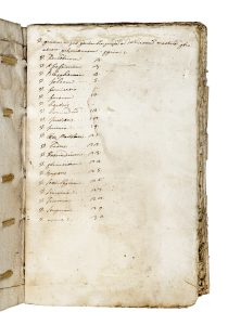 Manoscritto cartaceo a inchiostro marrone scuro compilato a rubrica. Carte 210 (numerate), cui seguono 2 carte scritte e varie bianche. Testo in latino e italiano. Legatura in pergamena con difetti. Dimensioni: 290x180 mm. (1)