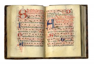 Manoscritto musicale pergamenaceo a inchiostro nero, rosso, blu, giallo, bordeaux. Fogli: [2 bianchi], [52], [1 bianco]. Frontespizio e antiporta decorati a più colori, seguiti da altro titolo 'Manuale Parvum / 1719', da una preghiera 'Psalmi faciunt nobis gratas esse vigilias noctis [...]', dal 'Repertorium', e dal testo musicale su tetragramma in notazione quadrata. Nel testo 9 iniziali maggiori decorate, circa 80 iniziali minorie (decorate) e oltre 100 iniziali semplici rosse e blu. Ex libris 'Il canonico Pietro Goretti Flamini'. Tagli dorati. Legatura in pelle. Dorso a comparti (con alcuni difetti). Dimensioni: 105x70 mm. (1)