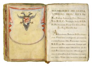 Manoscritto pergamenaceo a inchiostro dorato e bruno. 4 fogli. Testo in latino. Il primo foglio, al recto, è miniato con bordure di carattere floreale, le effigi di due santi (probabilmente S. Giuseppe con il bambino e Sant'Oliva) e, al centro, uno stemma araldico. Al verso del primo foglio, un'aquila bicipite. In fine le firme di vari funzionari. La legatura conserva al suo interno anche un foglio staccato, miniato ai bordi, con testo latino di ambito palermitano. Legatura in seta (con difetti) su cartone con nastri conservati. Dimensioni: 230x165 mm. (1)
