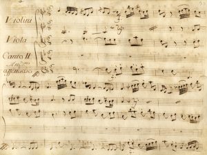 Manoscritto musicale a inchiostro marrone scuro. 80 carte (numerate da mano moderna). Partitura (Violini, Viola, Canto I, Canto II, Bassi). Carte senza legatura. Fascicoli legati tra loro e costola non presente. Dimensioni: 215x290 mm. (1)