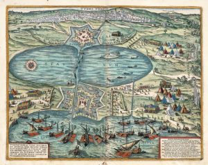 Incisione in rame, in coloritura. mm 322x420. Foglio: mm 403x540. Da Civitates Orbis Terrarum. Titolo in alto al centro, in basso ai lati cartigli. L'immagine mostra una vivace scena portuale, con navi alla fonda sul ​​primo piano nel porto esterno, canali di accesso al porto interno ed estese fortificazioni lungo l'acqua, con la città vera e propria su terreni più alti oltre il porto interno. (1)