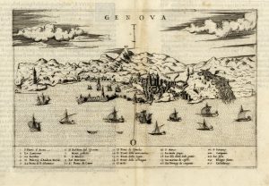 Acquaforte e bulino. mm 187x280. Foglio:mm 258x385. Con il titolo in alto al centro e testo didascalico descrittivo al verso. Al margine inferiore, legenda numerica su 5 colonne con 25 rimandi a luoghi e monumenti notabili. La carta è orientata con una rosa dei venti con indicazione dei quadranti, ma è priva di scala grafica. Tavola inserita ne Il primo libro delle citta et fortezze del mondo edito a Venezia nel 1567 e a seguire nella raccolta ristampata, inalterata, da Bolognino Zaltieri, De disegni delle più illustri citta, et fortezze del mondo di Giulio Ballino, pubblicata a Venezia nel 1569, dalla quale proviene il presente esemplare con testo al verso. (1)