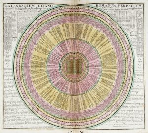 Acquaforte in coloritura coeva. mm 503x575. Foglio: mm 540x63. In alto di seguito al titolo "Augustae Vindel excudebat Matth. Seutter S.C.M Geographo" e in basso a sinistra "Cum Gratia et Privilegio S.R.I. Vicariatus in partibus Rheni, Sveviae et Juris Franconici.". Calendario perpetuo con didascalie in latino, basato sul calendario giuliano pubblicato da Francois Halma nel 1700. Agli angoli superiori sono collocate le tabelle per la conversione in gregoriano. Ottimo esemplare su carta vergellata apparentemente priva di filigrana. (1)
