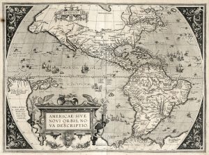 Incisione in rame. mm 352x485. Foglio: mm440x530. In basso a destra il titolo entro ricco cartiglio figurato e nell'inciso l'iscrizione "Cum Priulegio decennali Ab. Ortelius delineab. et excudeb. 1587". Testo latino al verso. Bella carta dell'America riccamente figurata ben impressa e inchiostrata. (1)