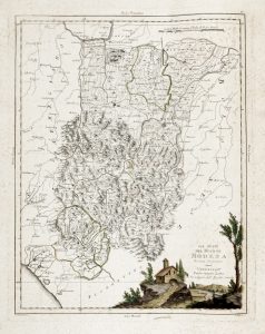 Acquaforte con cartiglio in coloritura. mm 420x325. Foglio: mm 480x400. Da Atlante novissimo, illustrato ed accresciuto sulle osservazioni e scoperte fatte dai più celebri e più recenti geografi, opera in 4 volumi, pubblicati tra il 1778 e il 1785, con incisioni perlopiù di Giuliano Zuliani e Giovanni Pitteri. L'area coperta dalla mappa corrisponde approssimativamente alle moderne province di Modena e Reggio-Emilia, e parti delle province di Massa e Carrara e di Lucca in Toscana. (1)