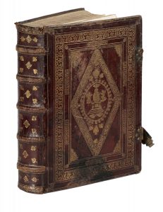 In-folio (mm 365x250). Legatura settecentesca in pieno marocchino su assi di legno. Ad entrambi i piatti ampie cornici concentriche impresse in oro e losanga centrale, anch'essa in oro, ospitante al piatto anteriore una scena religiosa e al piatto posteriore stemma anticamente abraso. Iniziali A. R. impresse ai piatti. Fregi fitomorfi al dorso a 5 nervi e dentelles alle unghiature; tagli decorati in oro, rosso e verde. Fermargli in pelle e metallo, uno dei quali staccato e conservato all'interno del volume. Spellature al dorso, abrasioni e macchie ai piatti, cuffie leggermente staccate e rari forellini di tarlo al dorso; punte stanche. Si vende come legatura. (1)