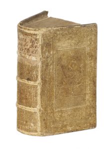 In-12° (mm 125x75). Carte [348]. Ritratto dell'Autore entro cornice ovale in legno al frontespizio. Integrazione di carta al margine superiore del frontespizio e lievi macchioline sparse, ma complessivamente ottimo esemplare. Sottolineature e postille manoscritte, soprattutto nella seconda metà dell'opera. Bella rilegatura in pelle di scrofa con timbro cieco con impressioni a secco ai piatti, raffiguranti l'immagine allegorica della giustizia e della castità; fregi a secco e titoli manoscritti su tassello al dorso a 3 nervi. Segni di usura, ma buono stato conservativo. Note manoscritte al contropiatto anteriore, recanti alcune note di possesso, di cui una riguardante l'acquisto del volume ad Augusta nel 1566. (1)