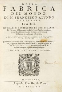 Alunno Francesco, Della fabrica del mondo [...] Libri 10 [...] Con un nuovo Vocabolario in fine, di tutte quelle voci, che mancavano... In Venetia: appresso Gio. Battista Porta, 1584.