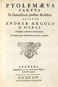 Argoli Andrea, Ptolemaeus parvus in genethliacis junctus arabibus. Lugduni: Sumptibus Iosephi, & Petri Vilort, 1654.