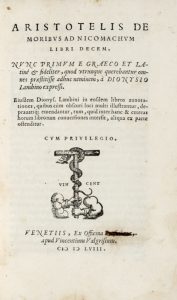 Aristoteles, De moribus ad Nicomachum libri decem. Venetiis: Ex officina Erasmiana, apud Vincentium Valgrisium, 1558.