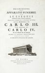 In-folio (mm 410x260). Pagine [2], XXIV + 10 tavole calcografiche fuori testo, di cui 2 più volte ripiegate. Vignetta al frontespizio e graziosa testatina con il ritratto di Carlo III alla carta a1r, entrambi incisi in rame. Marginoso esemplare su carta azzurrina, sporadicamente fiorito anche alle tavole; rinfrorzi marginali ad alcune carte, un forellino di tarlo al margine interno di quasi tutto il volume e un ampio strappo maldestramente restaurato all'ultima carta ripiegata. Legatura in mezza pelle con piatti in carta decorata; esemplare internamente allentato, con un foro di bruciaruta al piatto posteriore che coinvolge anche il margine superiore dell'ultima tavola ripiegata. (1)