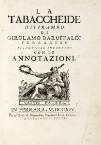 Baruffaldi Girolamo, La tabaccheide ditirambo. In Ferrara: per gli eredi di Bernardino Pomatelli impr. vescovali, 1714.