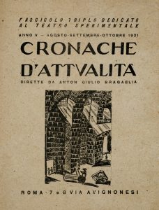 Bragaglia Anton Giulio, Cronache d'attualità. Anno V. Agosto-settembre-ottobre 1921. Fascicolo triplo dedicato al teatro sperimentale. Roma: [Stabilimento Poligrafico Editoriale Romano], 1921.