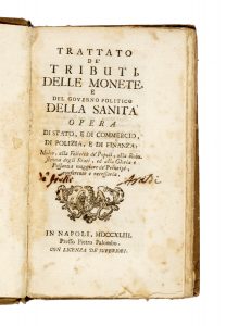 Broggia Carlo Antonio, Trattato de' tributi delle monete e del governo politico della sanità. Opera di stato, e di commercio, di polizia, e di finanza... In Napoli: presso Pietro Palombo, 1743.