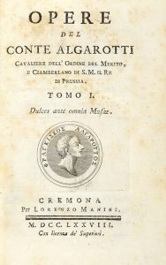 12 volumi in-8° (mm 195x125). Legatura coeva in piena pelle con titoli in oro al dorso e decorazioni dorate ai piatti. SI AGGIUNGE: Algarotti Francesco, Opere... Tomo 1 (-10). 10 volumi in-8° (mm 175x108). Legatura coeva in piena pelle con titoli in oro al dorso. (22)