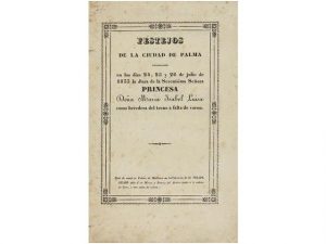 Felipe Guasp, 1833. 17,5x11,5 cm. 47 paginas. Cubiertas originales impresas, con doble orla recuadrando los planos. Muy buen ejemplar con grandes margenes. Portada impresa con variedad de tipos muy del estilo romantico. Edición original de esta descripción pormenorizada de los actos diversos que se celebraron en la ciudad de Palma para solemnizar la jura como heredera al trono de Isabel II. Narración anónima de la que desconocemos el autor y no conseguimos encontrar en Bover.