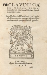 Galenus Claudius, De motu musculorum libri duo, Nicolao Leoniceno interprete. Parisiis: apud Simonem Colinaeum, 1528.