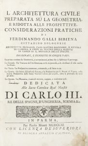 Galli Bibiena Ferdinando, L'architettura civile preparata su la geometria, e ridotta alle prospettive. Considerazioni pratiche [...] dissegnate, e descritte in cinque parti... In Parma: per Paolo Monti; in Bologna: appresso l'autore, 1711.