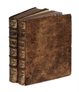 2 volumi in-4° (mm 260x195). Pagine [8], XXXVII, [3], 587, 1; [4], 587, [1]. Vignetta incisa in rame al frontespizio stampato in rosso e nero di entrambi i volumi; bella testatina xilografica alla dedicatoria. Esemplare uniformemente brunito, con lievi fioriture sparse, scompleto dell'antiporta con il ritratto dell'Autore al primo volume. Legatura coeva in piena pelle, con cornici di filetti impressi a secco ai piatti, fregi dorati entro comparti e titoli in oro su doppio tassello al dorso a 5 nervi. Sguardie marmorizzate e tagli rossi. Mancanze alle cerniere, forellini di tarlo ai piatti e al dorso, e mancanze alle cuffie.