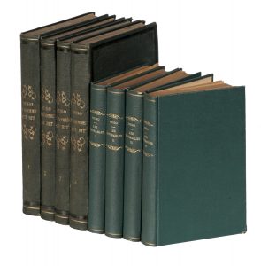 4 volumi in-8° (mm 230x140). Pagine 381, 1 bianca; 307, 1 bianca; 291, [5]; 380, [4]. Foxing, altrimenti ottimo esemplare in barbe. Legatura editoriale in piena tela verde, con cornici a secco ai piatti e titoli in oro al dorso; sguardie marmorizzate. SI AGGIUNGE: Id., Les Miserables. Paris: Ernest Flammarion, s.d. 4 volumi in-8. (8)