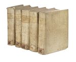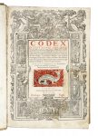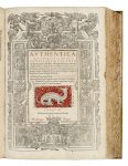 In folio (mm 405x268). Frontespizio in rosso e nero entro ampia cornice xilografica, numerosi capilettera in legno nel testo. Restauri alle prime carte e un lavoro di tarlo nell'ultimo. SI AGGIUNGE: Id., Digestum vetus [...] Digestorum, seu Pandectarum... Lugduni: ad Salamandrae, apud Sennetonios fratres, 1550. In folio (mm 405x270). SI AGGIUNGE: Digestum novum Pandectarum iuris civilis... Lugduni: apud Hugonem à Porta, 1550. In folio (mm 405x270). Infortiatum qui secundae est Digestorum tomus... Lugduni: ad Salamandrae, apud Sennetonios fratres, 1550. SI AGGIUNGE: Id., Institutionum [...] libri quatuor, ad vetustissimorum simul et emendatissimorum exemplarium fidem summa diligentia recogniti. Lugduni: apud Hugonem à Porta, 1550. In-folio (mm 405x280). SEGUE: Id., Authentica [...] Novellarum volumen eruditis animaduersionibus, adscriptionibusque pretextum... Lugduni: ad Salamandrae, apud Sennetonios fratres, 1550. Testo impresso in rosso e nero. Legatura omogenea settecentesca in piena pergamena rigida con titoli impressi in oro su falso tassello al dorso e sguardie marmorizzate. (5)