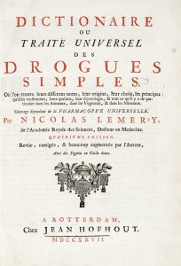 Lemery Nicolas, Dictionaire ou Traite universel des drogues simples. A Rotterdam: chez Jean Hofhout, 1727.