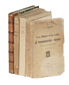 In-8° (mm 190x130). Pagine 319, [1]. Marca editoriale al frontespizio in rosso e nero. Ottimo esemplare in barbe, entro brossura editoriale con sovraccoperta, con titoli in rosso e nero al piatto anteriore. Minime fioriture. SI AGGIUNGE: Id., Les dieux s'en vont, D'Annunzio reste... Paris: E. Sansot & c.ie, 1908. SI AGGIUNGE: Nosari Adone, La saletta d'Aragno... Roma: Sapientia, 1928. SI AGGIUNGE: Soffici Ardengo, Statue e fantocci. Firenze: Vallecchi, 1919. (4)