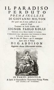 Milton John, Paradiso perduto poema inglese [...] del quale non si erano pubblicati se non i primi sei canti tradotto in verso sciolto dal signor Paolo Rolli... In Parigi [ma Verona]: A spese di Giannalberto Tumermani, 1742.