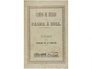 1872. (FERROCARRIL(). CAMINO DE HIERRO DE PALMA A INCA. RESÚMEN DE LOS TRABAJOS DE LA COMISIÓN. Palma: Imprenta de Pedro José Gelabert, 1872. 4°. 31 p. Cubiertas originales con orla tipografica y un pequeno grabado del ferrocarril, con leves...