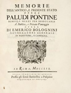 Bolognini Emerico, Memorie dell'antico, e presente stato delle paludi pontine... In Roma: nella Stamparia di Apollo presso gli eredi Barbiellini a Pasquino, 1759.